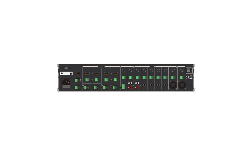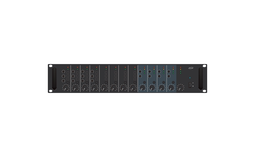 - 4 Mic/Line input level (CH1-4) controls with 3-band EQ and output selector switches.